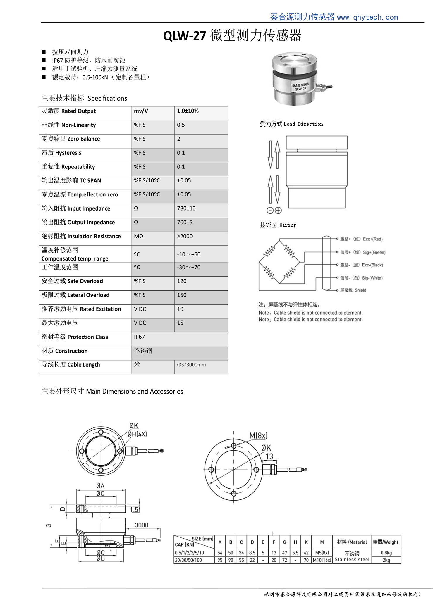 產品名稱:QLW-27小型柱式拉壓力傳感器(0.5-100kN),φ54mm