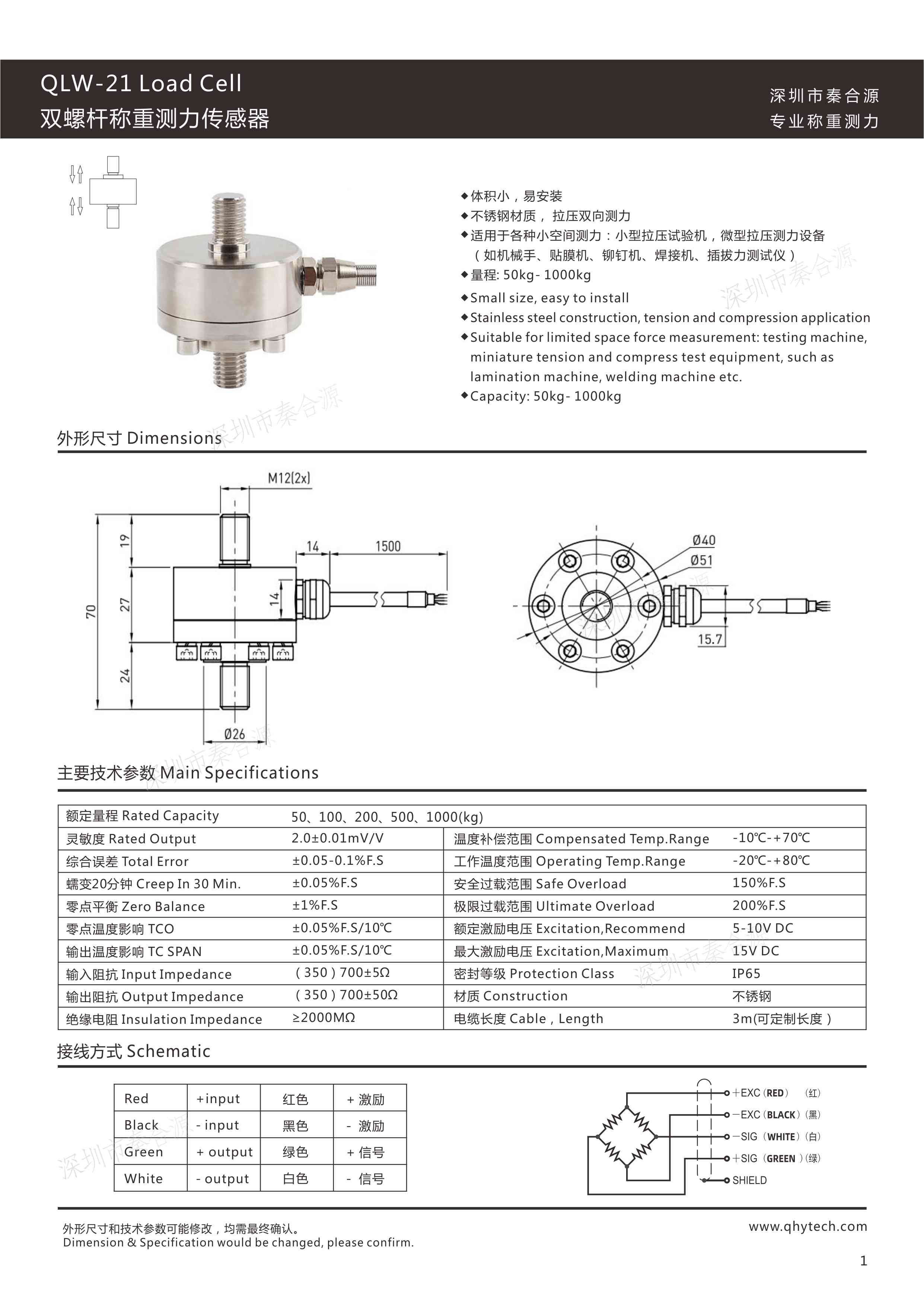 秦合源雙螺桿傳感器,此款傳感器可以同時測量推拉兩個方向的力,體積小,精度高,安裝簡單,穩定性好,性價比高。常規模擬傳感器輸出信號(靈敏度)為mV信號(0.5mV/V-3mV/V),信號變送器(放大器)可以接收mV信號,同時把傳mV信號放大為電壓信號(0-5V、0-10V)或者電流信號(4-20mA、0-20mA),同PLC對接。 秦合源經驗豐富、技術精湛,為各行業用戶提供精準測力傳感器及測力方案。
